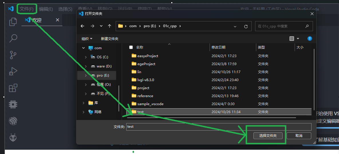 打开文件夹,这个文件夹里将保存你开发的项目工程,例如一堆.c .h文件。