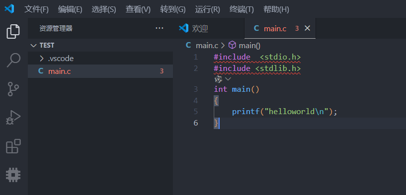 可以看到没有代码提示,也检测不到头文件,这是因为,VSCode只是一个文本编辑器,就像记事本一样,所以我们要进行配置,才能使用。