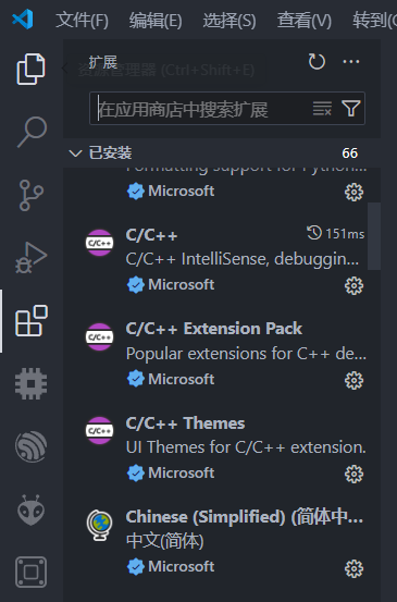 先安装几个必要插件,Chinese插件可以汉化软件,上面三个C/C++相关的可以提供C语言支持(不包括编译器),例如代码提示,路径检测等功能。