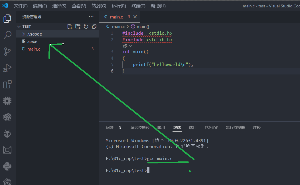 在终端输入gcc main.c,可以看到编译后产生的可执行文件a.exe