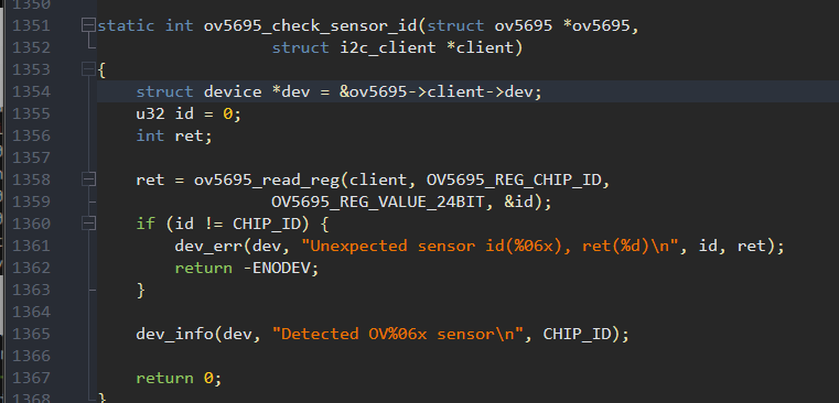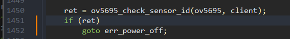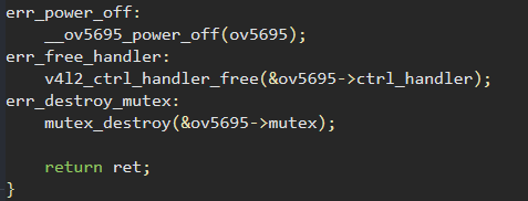 可以发现,ov5695_check_sensor_id()函数会用于检查摄像头的id,比如OV5695的CHIP_ID就是5695,但如果没检测到,就会goto到err_power_off执行下面的三个语句,销毁释放摄像头的一切资源。
