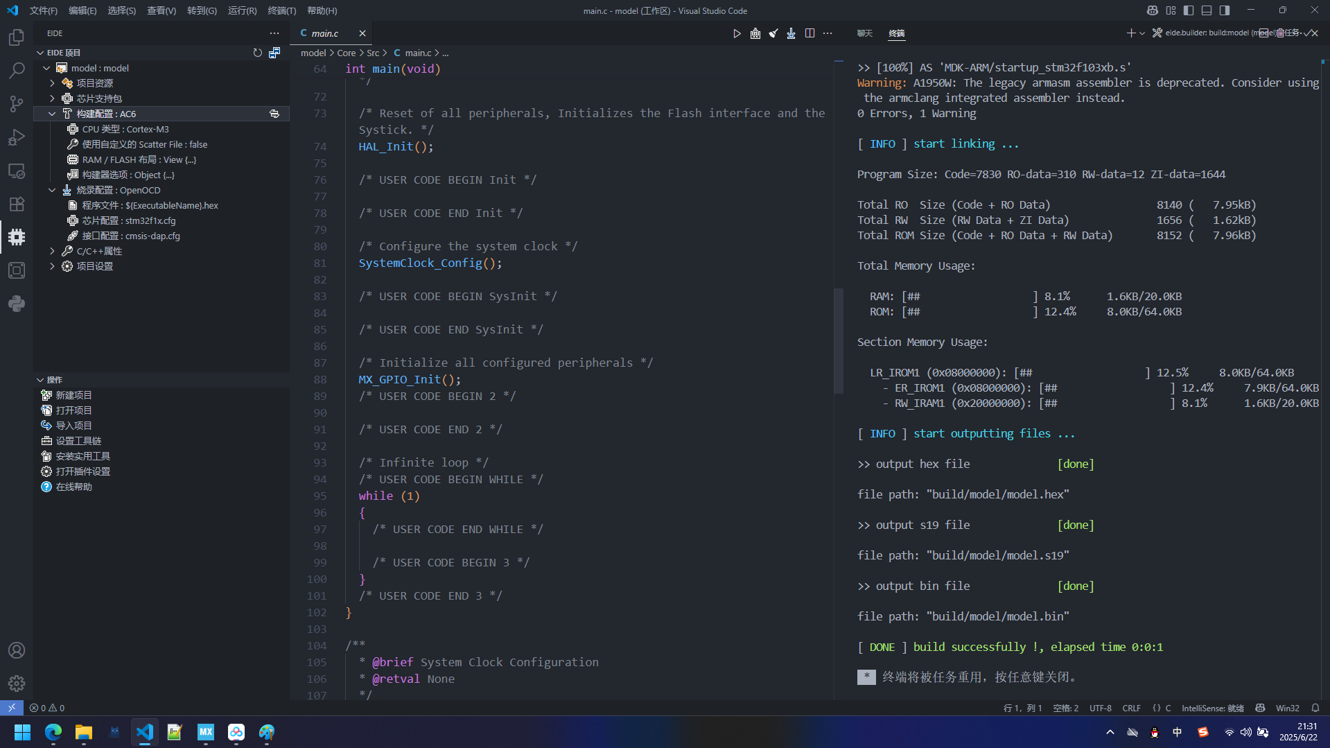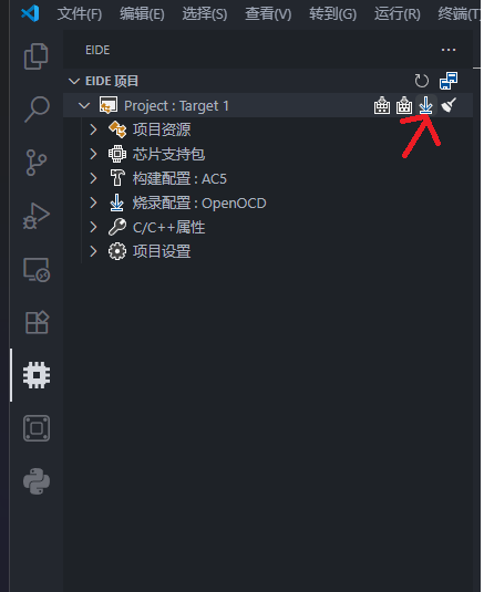 选择“AC6编译器”,点击编译图标,可见编译没有问题,烧录时选择OpenOCD,然后选择自己对应的调试器型号即可烧录。