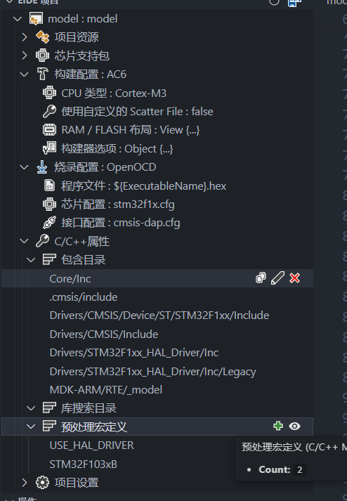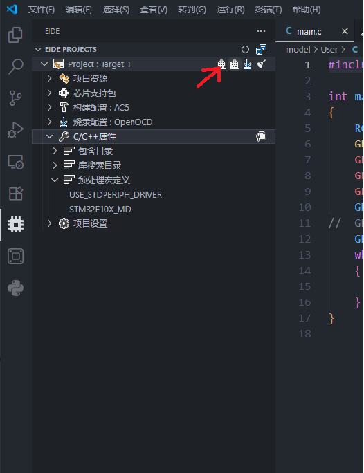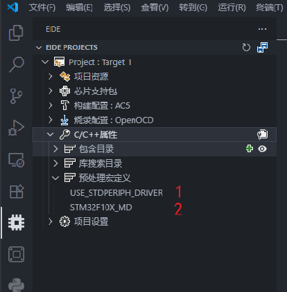 在C/C++属性中添加预处理宏定义,根据自己的库类型和芯片型号填写,例如:STM32F103C8T6属于中容量产品,就添加STM32F10X_MD